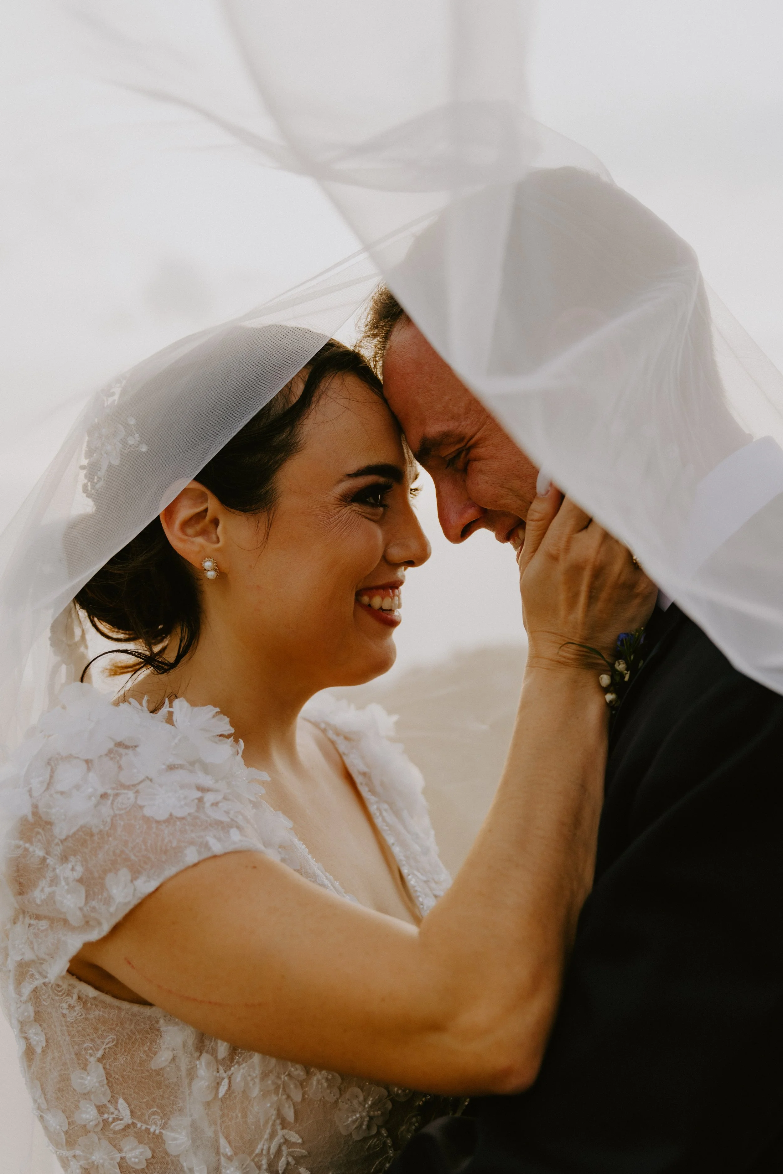 A bride and groom standing close together under a veil, smiling and touching foreheads, during their wedding.