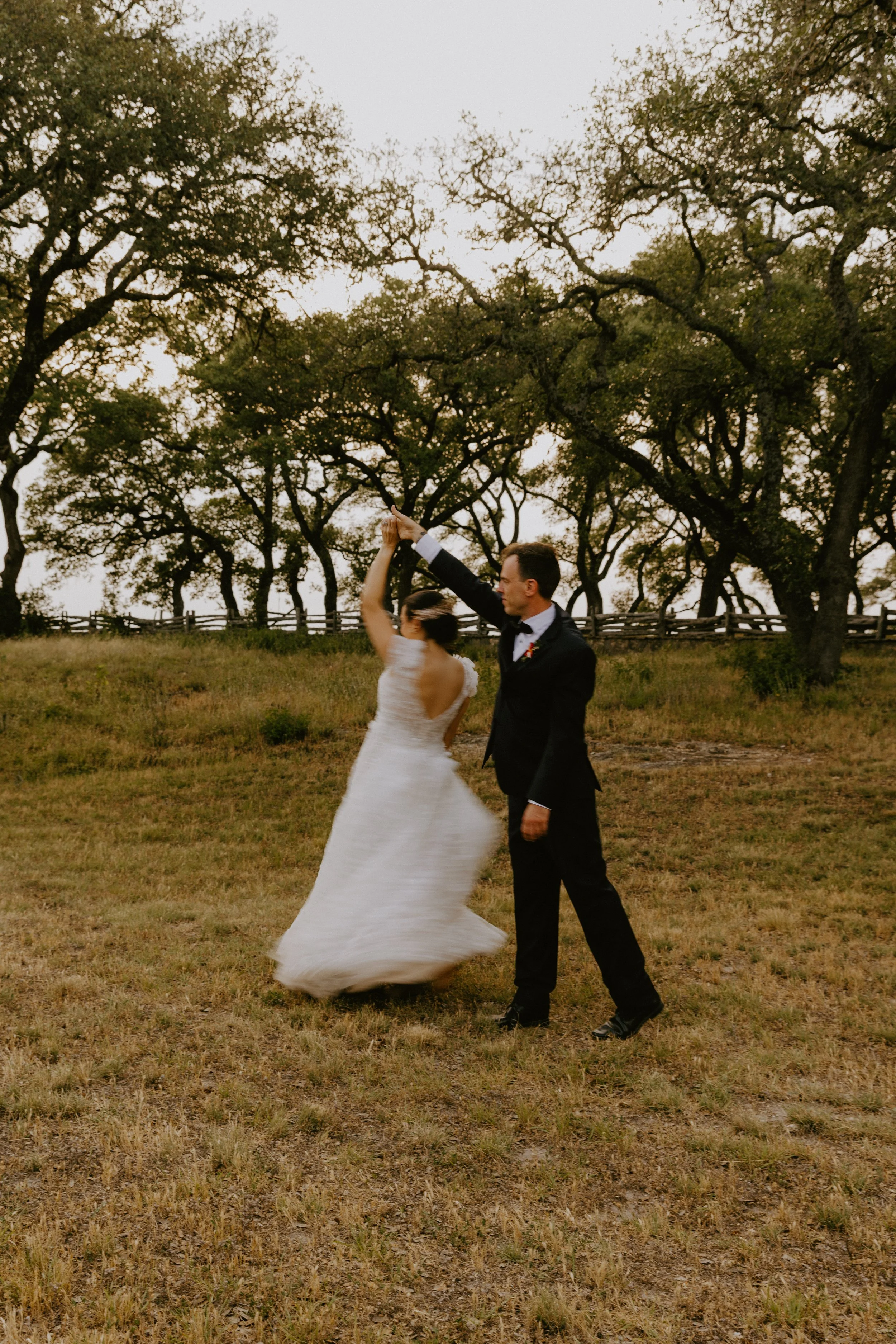 A bride and groom dancing outdoors on grass with trees in the background during sunset.