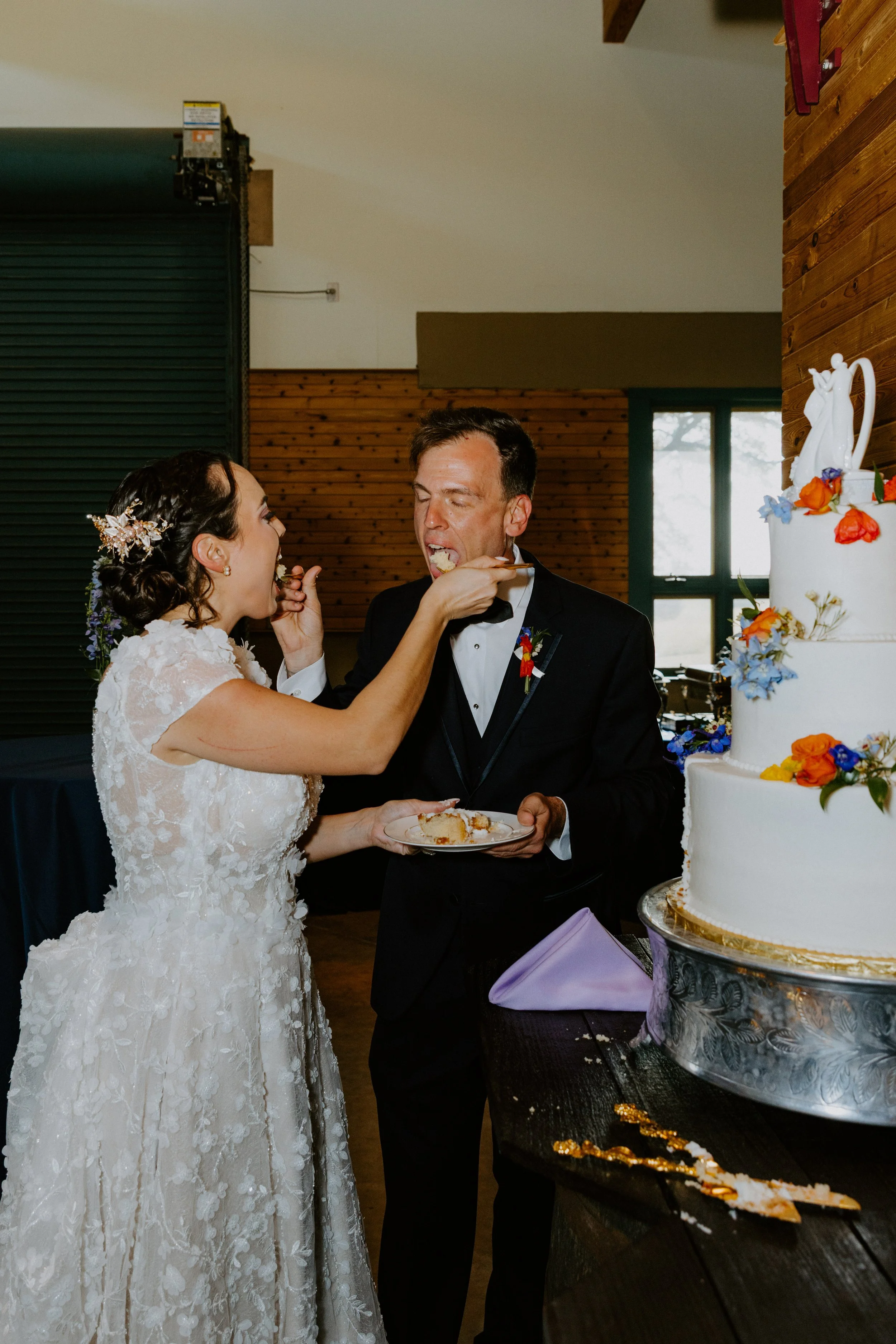 Bride in lace wedding dress feeding cake to groom in black tuxedo at wedding reception, large white tiered wedding cake with colorful flowers in the background.