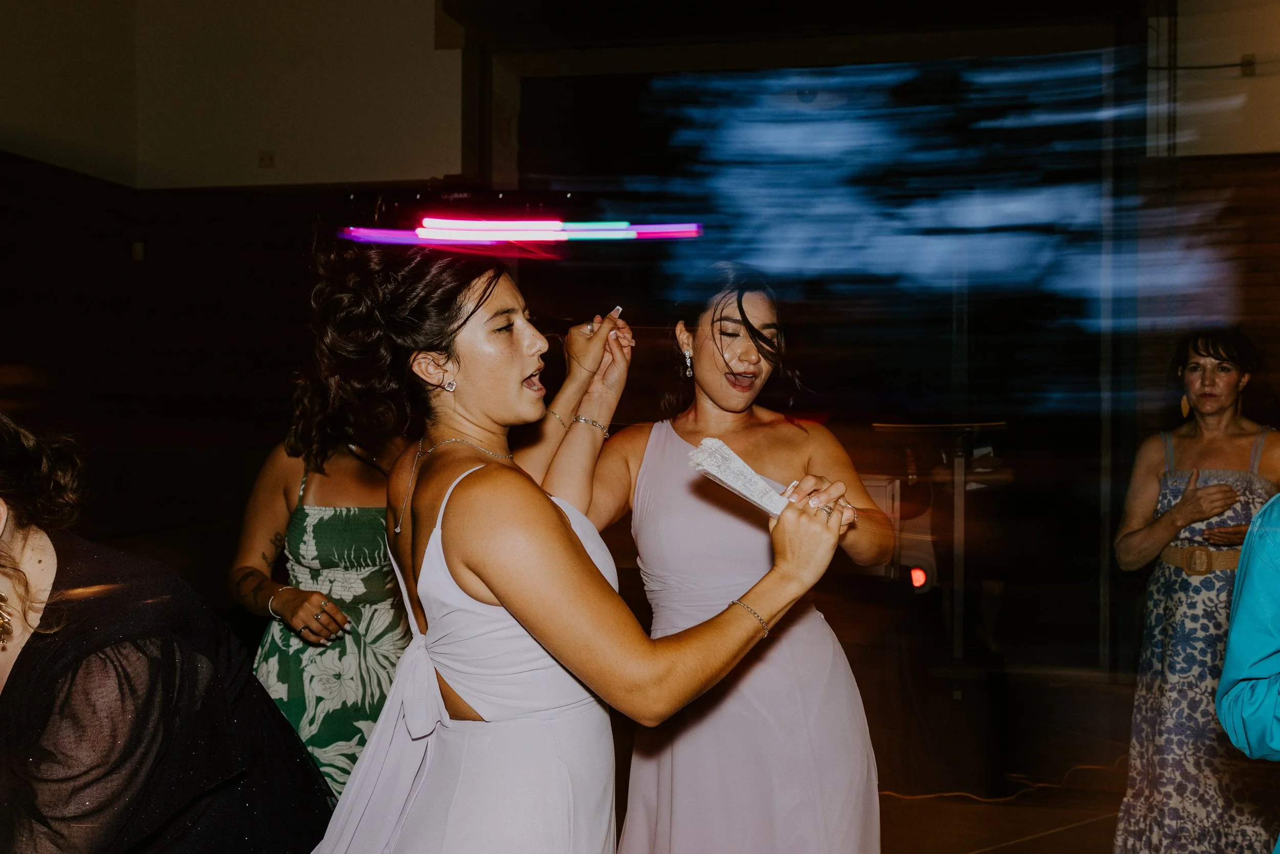 Two women in dresses are dancing at a celebration, one holding a fan, with a woman in the background in a patterned dress and a blue top. Colorful light streaks and a dark indoor setting are visible.