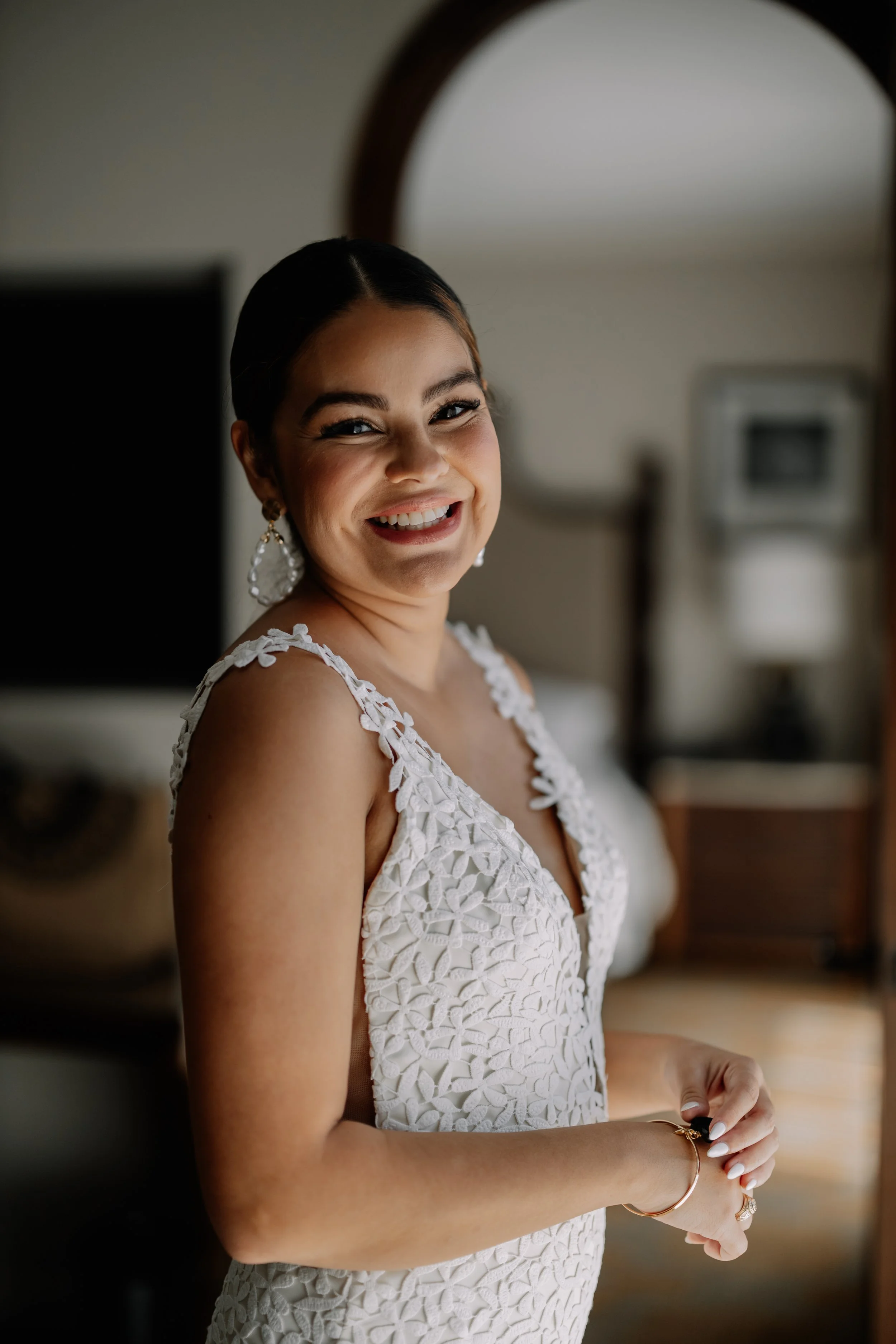 A woman with dark hair and a white lace dress smiling while standing indoors, with a mirror in the background.