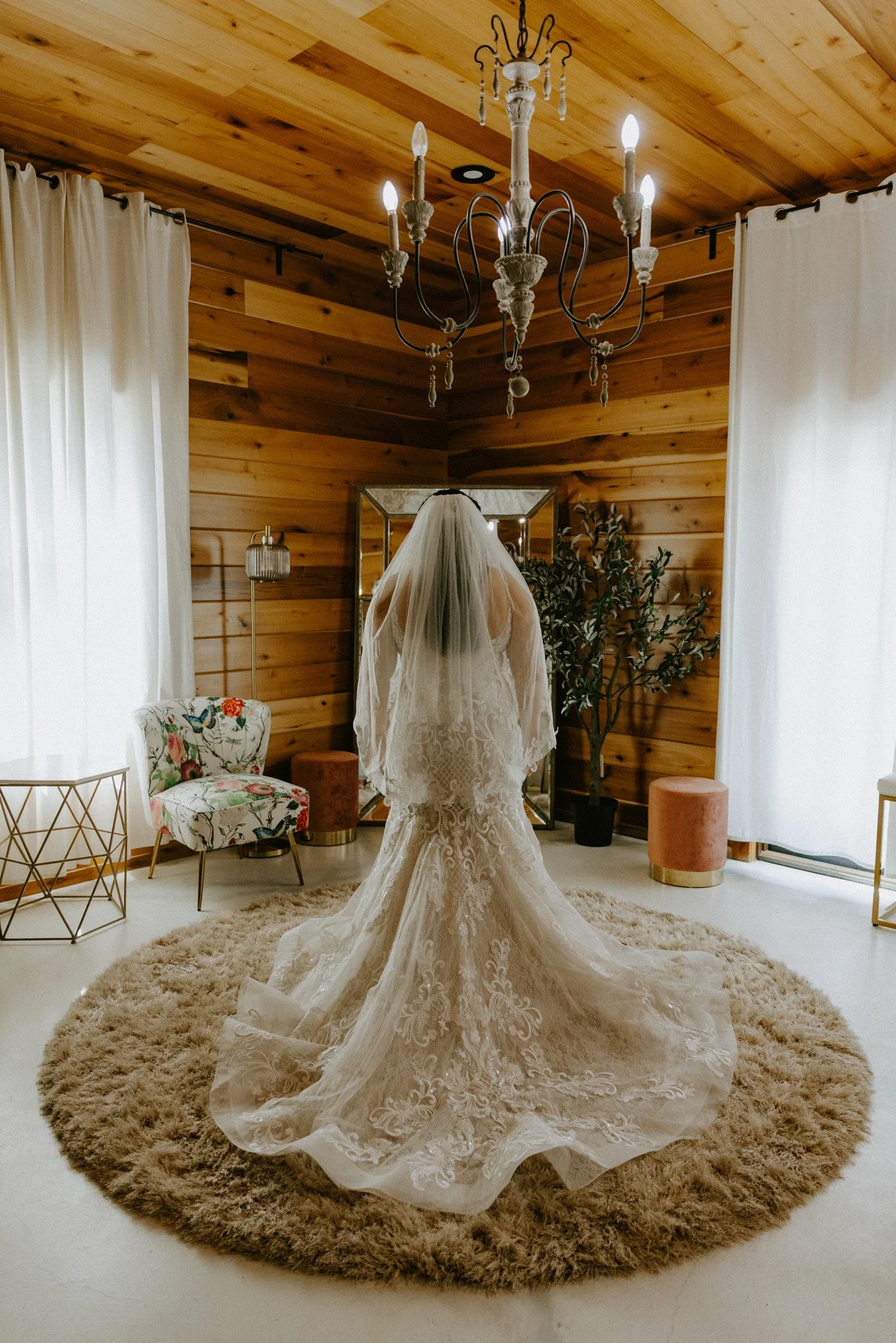 A woman in a white, ornate wedding gown with a train stands in a room with wooden walls, looking at herself in a mirror.
