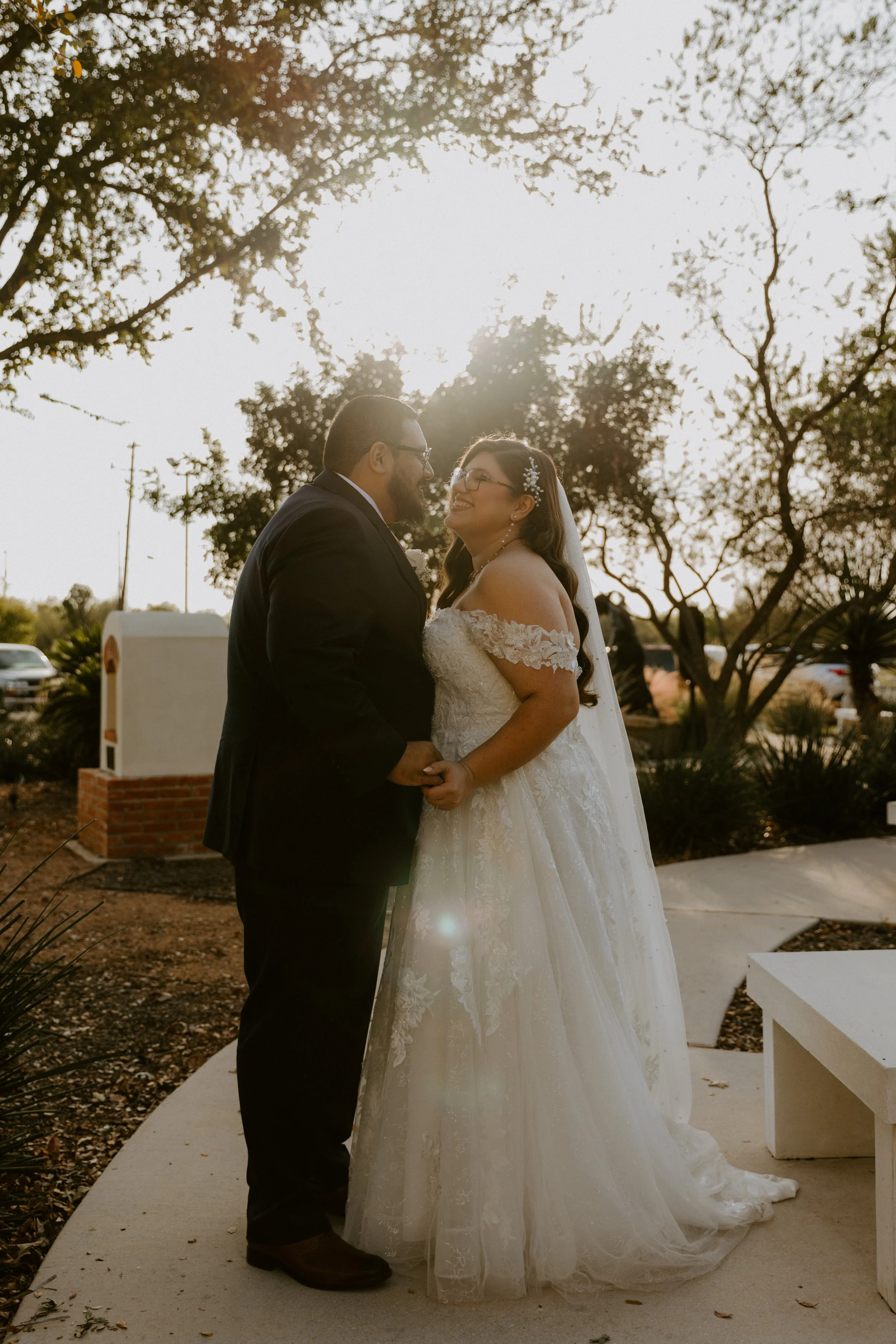 A bride and groom holding hands and smiling at each other outdoors during sunset, with bare trees and a sunny sky in the background.